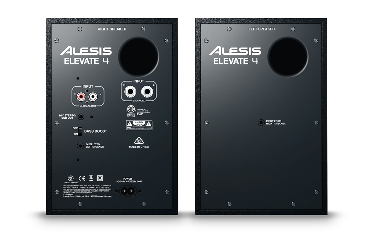 Alesis Elevate 4 - это новая 2-х полосная полуактивная Hi-Fi акустическая система, номинальная мощность которой составляет 2х25 Вт, а частотный диапазон 68 Гц-20 кГц. АС полуактивная - один монитор активный и имеет встроенный усилитель, второй пассивный, и подключается к первому.