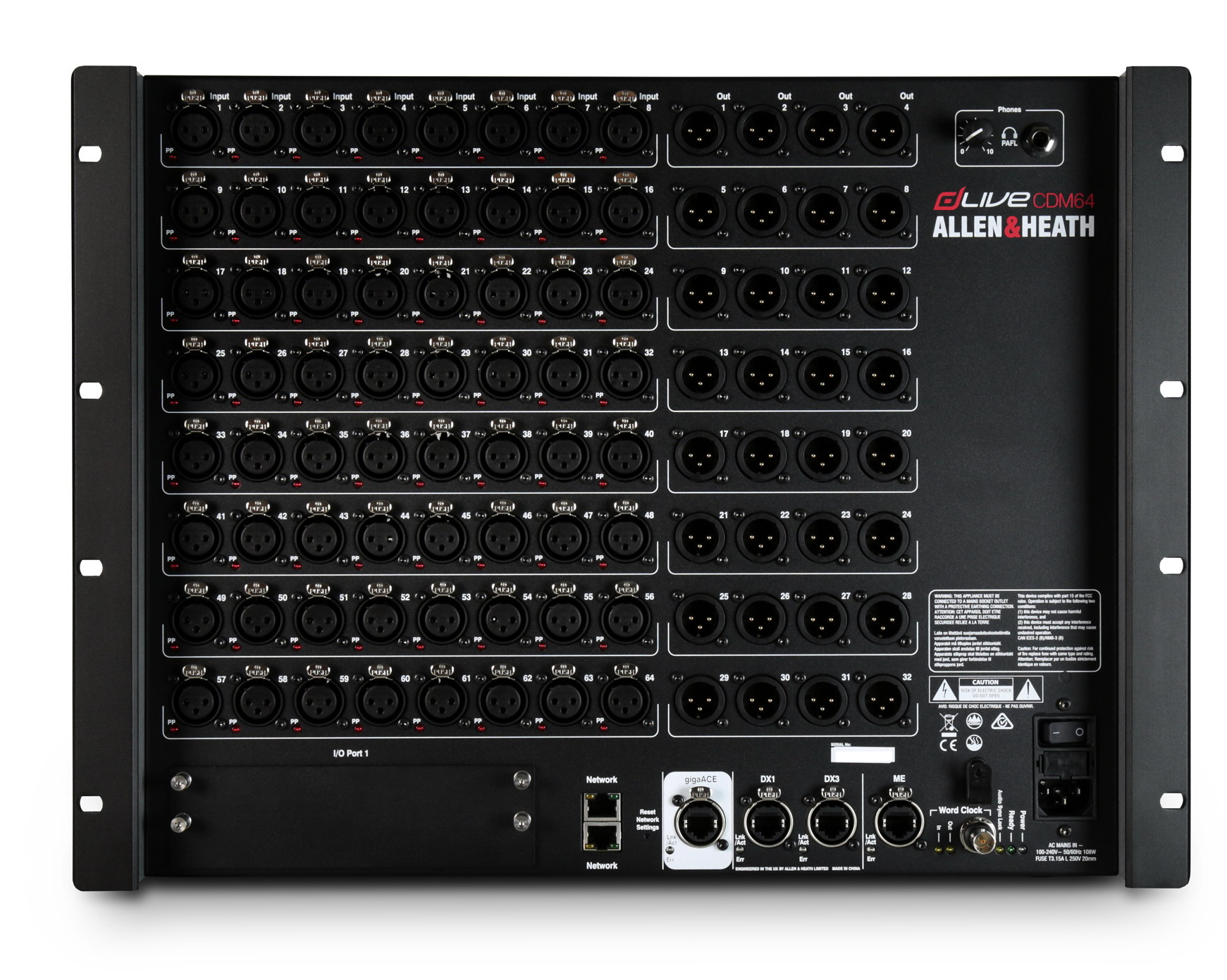 Allen&Heath dLive-CDM64 - системный рэк с процессором XCVI Core (96 кГц/96 бит), который обеспечивает обработку 128 входов и возможность использования 24 стерео возврата с эффектов и 64 настраиваемых шины. Системный рэк имеет 128-канальный слот расширения для карт ввода/вывода, включая Dante, Waves, MADI, fibreACE и др.