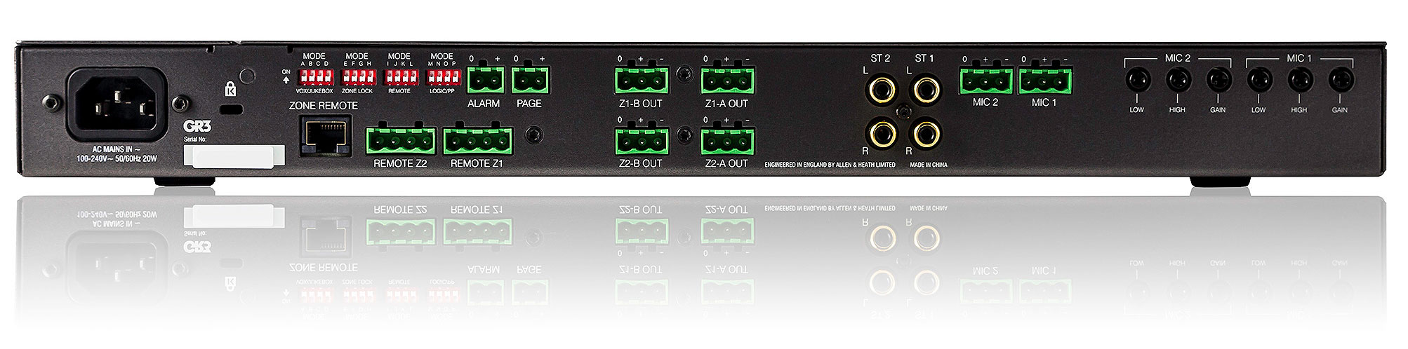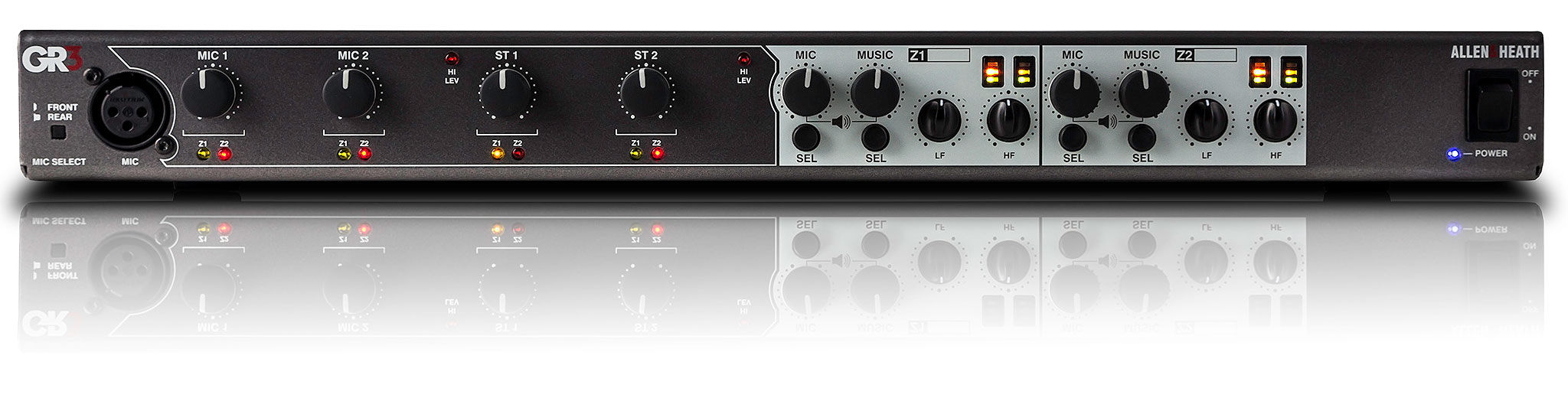 Allen&Heath GR3 – аналоговый рэковый зонный микшер предназначенный для управления трансляцией музыки и передачи голосовых сообщений на несколько зон, например, в торговых и развлекательных заведениях. В задачи Allen & Heath GR3 входит настройка воспроизведения фоновой музыки и голосовых сообщений на 2 индивидуально управляемых зоны с заданием в них сигналов от входов. Иначе говоря, для коммутации различных источников звука с назначением их приоритета.