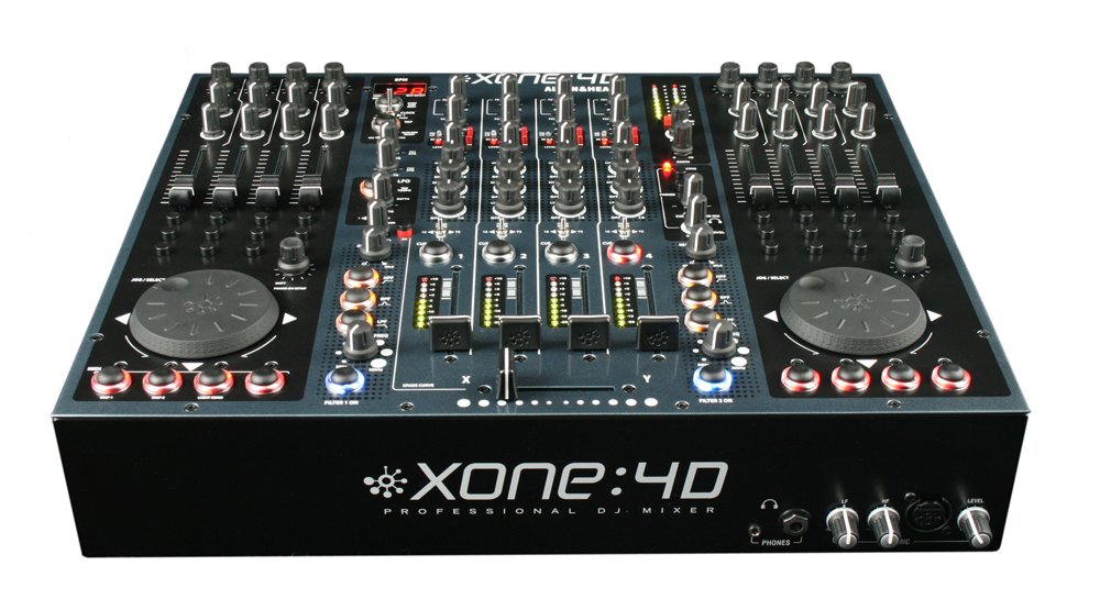 XONE4D - DJ микшер-контроллер нового поколения, разработанный на основе хорошо известного Xone:3D, который произвел настоящую революцию на рынке профессионального DJ оборудования. Xone:4D, как и его предшественник, совмещает в себе профессиональный аналоговый DJ микшер, 2 контрольные панели MIDI (Xone:4D может посылать до 105 сообщений MIDI контроля) и 20-канальную USB 2.0 аудиокарту с частотой дискретизации 96 кГц/24бит. Микшерная часть имеет 4 стерео канала, на каждом есть пара линейных входов (RCA), вторая пара входов на разъемах RCA (на 1 канале — линейные, на 3-х остальных каналах — для проигрывателя винила, джамперами переключаются в линейный режим), регуляторы уровня посыла на 1 и 2 вспомогательные шины (1 имеет переключатель отбора до/после фейдера, 2 — пре-фейдерный), 2 кнопки выбора входов (1/2 пары или входы компьютерного интерфейса), регулятор уровня, регуляторы 3-х полосного эквалайзера, переключатель назначения на фильтр и кроссфейдер, кнопка прослушивания, фейдер и 9-сегментный светодиодный индикатор уровня. Есть кроссфейдер (VCA) с кнопкой включения и регулятором характеристики, автоматический определитель темпа (сигнала основной шиной или второго посыла на эффекты, возможны передача сообщений MIDI Clock и ручной ввод темпа), два 9-сегментных светодиодных индикатора выходного уровня, 2 управляемых фильтра (VCF). Каждый фильтр имеет выключатель, регулятор частоты, переключатель типа фильтра (верхних частот, нижних частот, полосовой), регулятор резонанса. Для модуляции фильтров можно использовать LFO с регулятором глубины. Органы управления MIDI-контроллера расположены по бокам от микшера. Есть восемь назначаемых слайдеров, 16 назначаемых вращаемых регуляторов с фиксацией в центре, 10 назначаемых вращаемых датчиков с возможностью нажатия, 50 назначаемых переключателей, 2 назначаемых колеса (каждое с 4 назначаемыми микропереключателями), 8 назначаемых кнопок с подсветкой. Некоторые органы управления микшера также производят MIDI-сообщения. Прилагается программа Ableton Lite Live 5 Xone с соответствующими накладками для MIDI-контроллера. Компьютерный интерфейс для шины USB 2.0 может передавать 8 аудиоканалов одновременно (есть 2 режима: 6 каналов с компьютера и 2 обратно, по 4 канала в каждую сторону). Преобразователи 24-разрядные, частота дискретизации 96 кГц. На аудиоинтерфейс можно направить сигналы с основной шины, первого посыла или напрямую с каналов. Также передается MIDI-информация. Прилагается ASIO-драйвер. Устройство имеет микрофонный вход (XLR) с регулятором чувствительности и эквалайзером с регулятором уровня, 2 мониторных выхода (RCA) с регулятором уровня, 2 выхода для наушников (1/4 Jack и 3.5 мм miniJack) с регулятором уровня и регулятором баланса уровней шины прослушивания и основной шины, 2 пары выходов посылов (RCA), 2 пары возвратов (RCA) с регуляторами уровней, 3 пары выходов аудиоинтерфейса (RCA), электрический (RCA) и оптический цифровые интерфейсы формата SPDIF, MIDI-вход и выход, порт USB, вход для педали (1/4 Jack), вспомогательный 15-контактный D-Sub разъем (можно использовать для подключения джойстика или в качестве дополнительного MIDI-выхода).