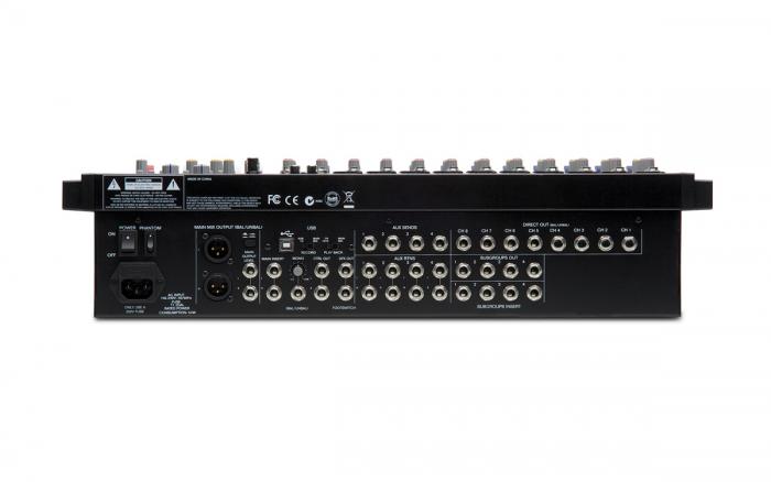 16-канальный микшер, 10 микрофонных входов, +48 V, DSP 24 бит (256 программ), 4 стереопары TRS, 4-полосный EQ + 9-полосный графический, фейдеры 60 мм, 4 AUX, 4 подгруппы, 2 выхода для наушников.