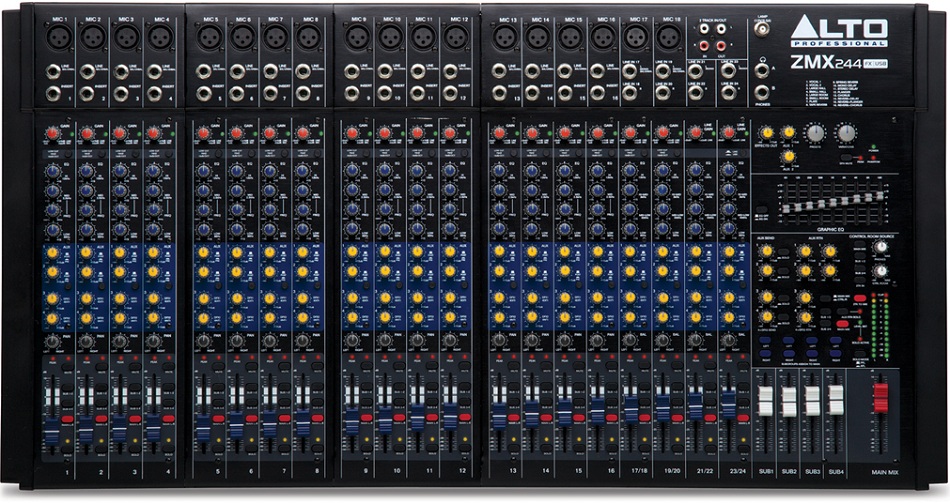 Alto Professional Zephyr ZMX244FX USB - это 24-канальный, микшер с гибкой маршрутизацией, эквалайзером и процессором эффектов. Пульт имеет 18 микрофонных входов с разъемами XLR и TRS, 3-х полосным эквалайзером с параметрической серединой и обрезным фильтром, а также 4 стерео входа с 4-полосным эквалайзером, 60 мм высокоточные фейдеры и 4 AUX шины. ZMX244FX USB дает все возможности, которые необходимы микшерному пульту при живом исполнении.