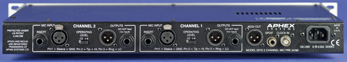 На задней панели расположены входы (XLR), симметричные выходы (XLR и Jack, переключаются между +4 дБ и -10 дБв), разъем для дистанционного управления заглушением канала (Jack), цифровой выход формата AES/EBU (XLR), вход и выход word clock (BNC).