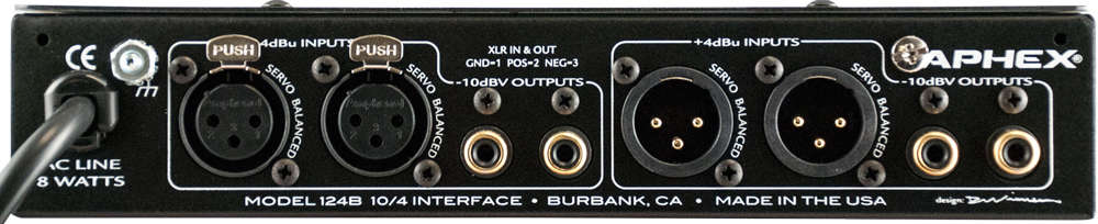 Aphex 124A - стерео двусторонний интерфейс уровней аудио сигналов. Преобразование из -10dBV в + 4dBu и наоборот. Aphex 124A позволяет использовать домашнее Hi-Fi оборудование вместе с профессиональными аудиосистемами, усиливать сигнал для "длинних" линий; может быть использован в качестве сплиттера (1 балансный вход XLR, RCA х 2 небалансных выхода) или предусилителя.