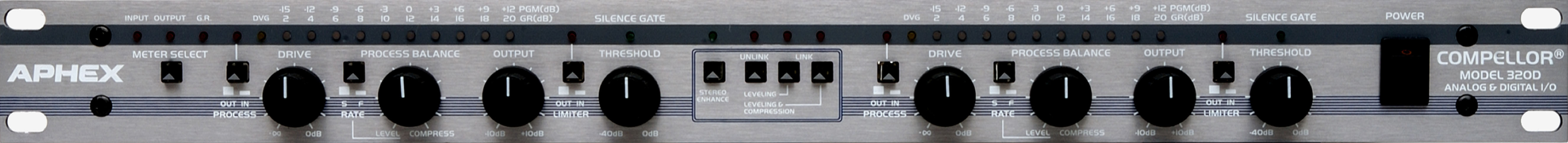 В упрощенном виде звуковой тракт компеллора (Compellor) состоит из серво-балансной входной цепи, всемирно известной схемы Aphex 1001 VCA и нового серво-балансного выходного каскада с электронной схемой управления, который может работать в несимметричной конфигурации. Специальный переключатель на задней панели компеллора модели 320D (0 VU на индикаторе) позволяет выбрать одно из трех значений номинального рабочего уровня: -10dBV, +4dBu или 8dBu, решая, тем самым, проблему согласования практически с любой системой.