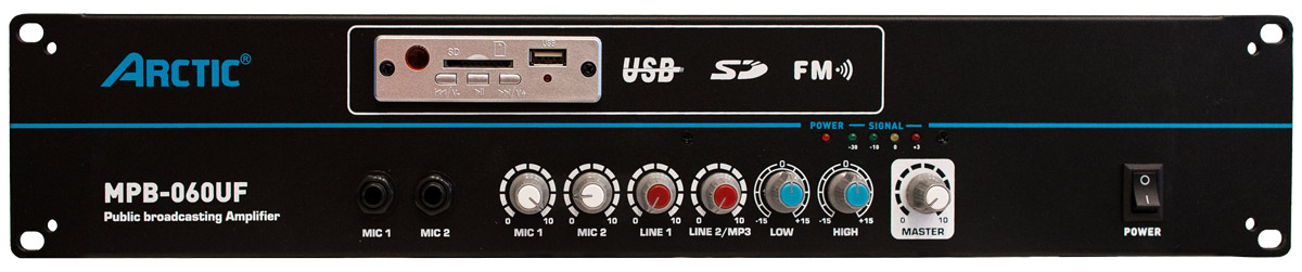 Трансляционный усилитель для 70/100В линий, мощность 60 Вт, 2xмикр. (1/4"Jack), 2xлинейных (RCA),2-полосный эквалайзер, USB/SD медиаплеер+FM радио, выход: 8-16 Ом/70V-100V, габариты 482х262х89 мм.