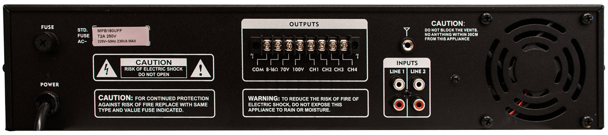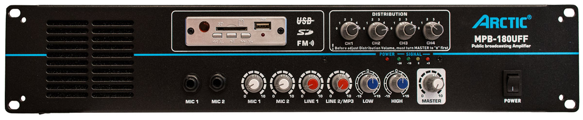 Трансляционный усилитель для 70/100В линий, 180 Вт, 2xмикр., 2xлинейных входа,2-полосный EQ, USB/SD медиаплеер+FM радио, 4 линии с индивидуально регулируемым уровнем, выход: 8-16 Ом/70V-100V.