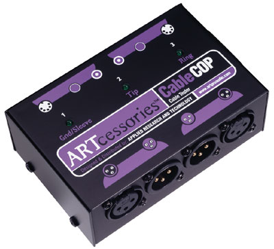 Универсальный кабельный тестер, проверка контактов и правильности соединения, тест симметричных / несимметричных разъемов XLR, 1/4 Jack, DIN5 (midi)и RCA, питание от 9В батареи (в комплекте) или дополнительного блока питания, габариты 180 х 76 х 40 мм, вес 0.454 кг