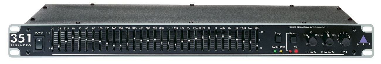ART EQ351 одноканальный 31-полосный 1/3 октавы графический эквалайзер с точной схемой фильтров постоянной добротностью центральной полосы - 3%. Эквалайзер оборудован 20 мм ползунками с выбираемым усилением / ослаблением диапазона на 6 дБ или 12 дБ, симметричными и несимметричными входами и выходами, индикаторами входного и выходного уровня, регулируемыми ВЧ и НЧ фильтрами, регулятором уровня, индикатором уровня перегрузки, переключателем заземления, внутренним источником питания и переключателем напряжения. Диапазон регулирования фейдеров позволяет установить максимальное усиление или ослабление для каждой из 31 полос на уровень 6 дБ или 12 дБ. ВЧ фильтр срезает низкие частоты, которые являются паразитными и не приносят (гул или низкочастотные взрывы). Диапазон настройки регулируется от 10 Гц до 250 Гц. Частоты же ниже этого диапазона полностью срезаются, в то время как частоты выше остаются неизменным. НЧ фильтр срезает высокие частоты, которые производят посторонний шип или чрезмерно насыщенным ВЧ сигналом. Его диапазон регулируется в пределах от 3 кГц до 40 кГц. Прочный стальной корпус имеет высоту 1U и может монтироваться в стандартные 19-дюймовый стойки.