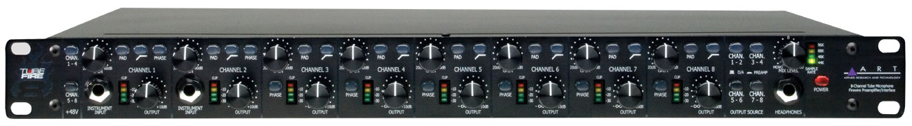 TubeFire8 имеется восемь ламповых предусилителей, в каждом из которых предусмотрены переключатель чувствительности PAD, переключатель полярности фазы и обрезного фильтра 100 Гц -6 Дб/Окт. Регулировка уровня сигнала обеспечивается в два этапа: сначала во входном каскаде регулятором Gain, и затем в ламповом каскаде регулятором Output, контроль сигнала возможен по 4 уровневому индикатору уровня в каждом канале. Фантомное питание для микрофонных входов подаётся раздельно для каналов с 1 по 4 и с 5 по 8. Первые два канала интерфейса дополнительно имеют высокоомные входы для подключения гитар на разъёме Jack. Все 8 микрофонных/линейных входов выполнены на комбинированных разъёмах XLR/Jack и расположены на задней панели. Там же располагаются 8 балансных выходов на разъёмах Jack. Они могут использоваться как direct-выходы для предусилителей либо как выходы FireWire интерфейса.