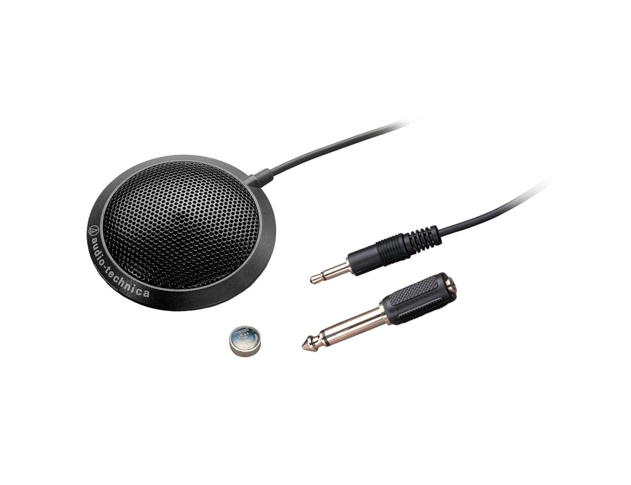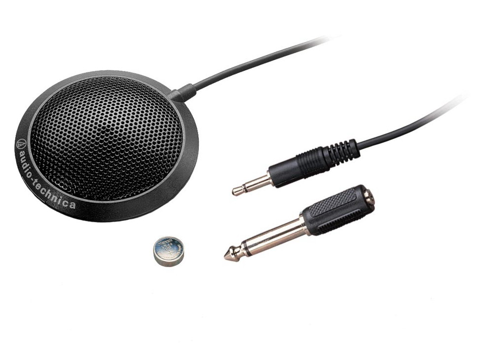 Поверхностный конденсаторный всенаправленный микрофон, АЧХ 50 Гц - 15 кГц, чувствительность -46 дБ, импеданс 1 кОм, выход 3,5 мм TS Mini Jack, питание: 1 батарея.