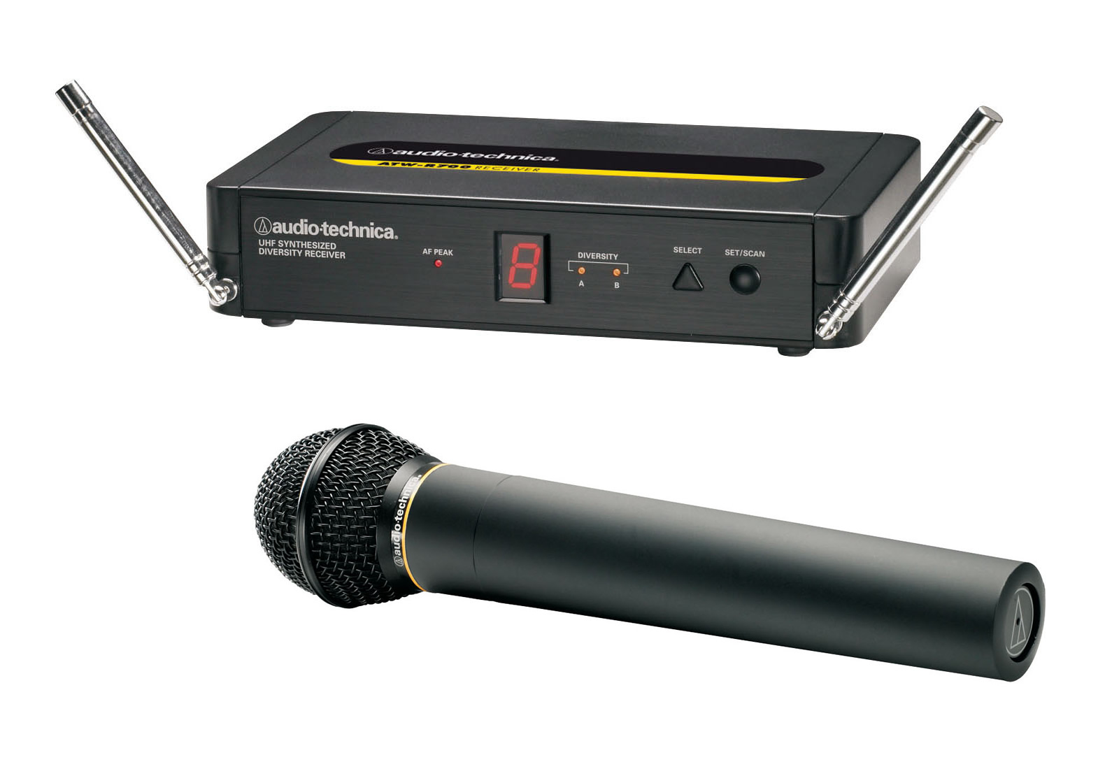 Audio-Technica ATW-702 UHF радиосистема, диапазоны частот: Е (800..820МГц), F (840..865МГц), 8 каналов, приемник ATW-R700, ручной узконаправленный динамический передатчик ATW-T702, держатель на стойку
