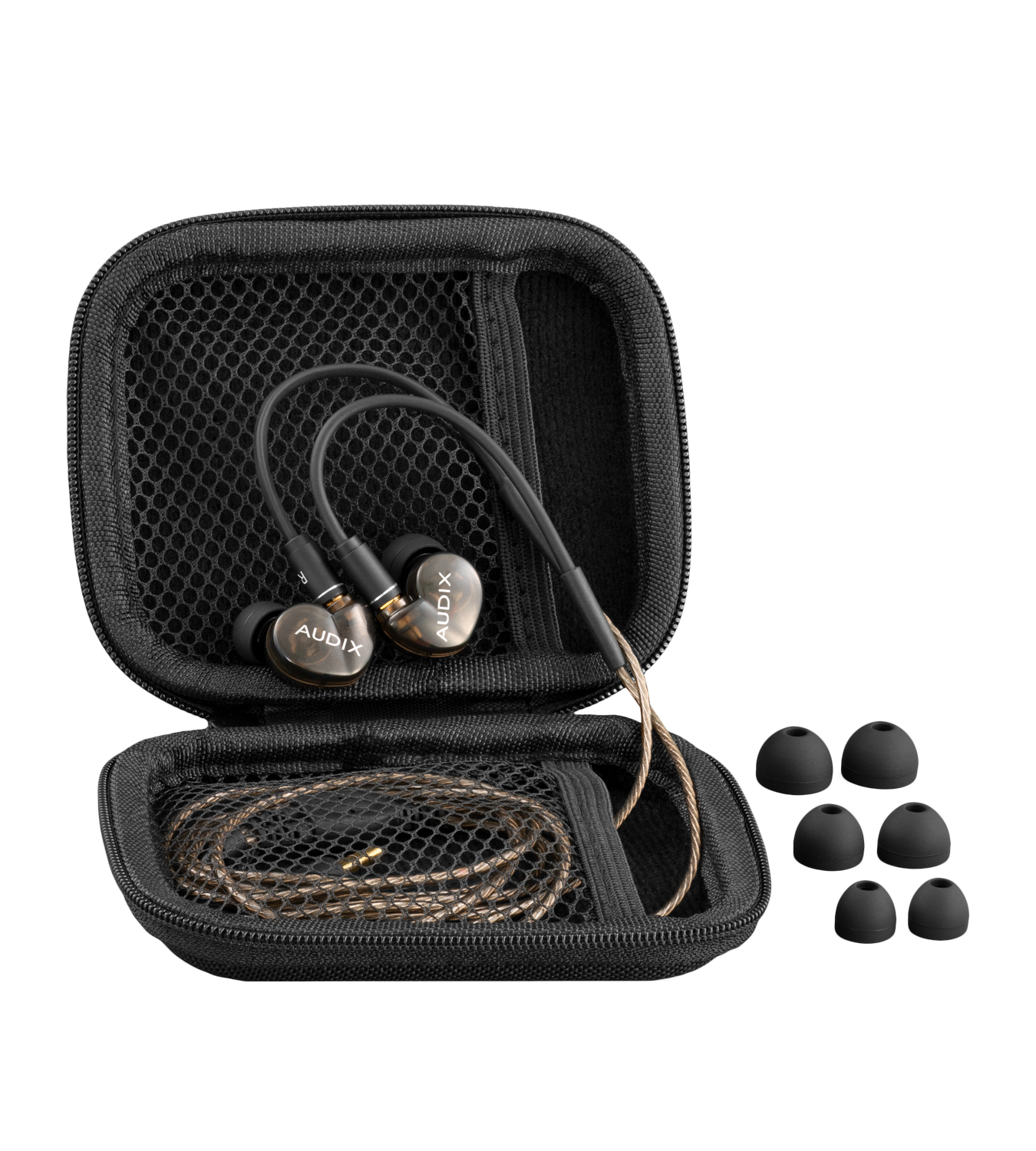 - Оптимізовані силіконові вушні вкладиші (S, M, L) для надійної герметизації та ізоляції