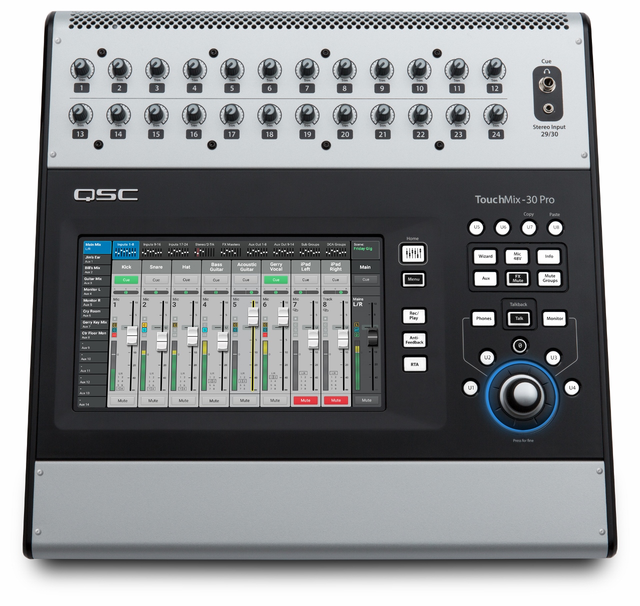 QSC TouchMix-30 - цифровой микшерный пульт оснащен 24 предусилителя класса A и является идеальным решением для продакшн-студий, музыкальных коллективов, а также хорошо подойдет для живых выступлений. Основной "фишкой" новинки является наличие сенсорного TFT-дисплея высокого разрешения, который обеспечивает интуитивное управление всеми параметрами микширования. Диагональ сенсорного дисплея составляет 10". Кроме того, имеется поддержка мультитач. Также предусмотрена возможность беспроводного управления микшером с экрана мобильного устройства на базе iOS или Android.