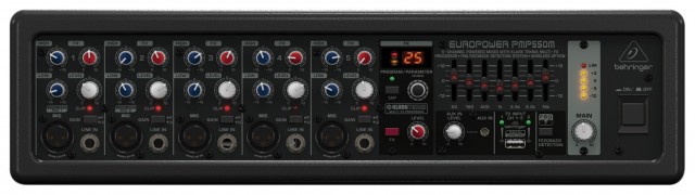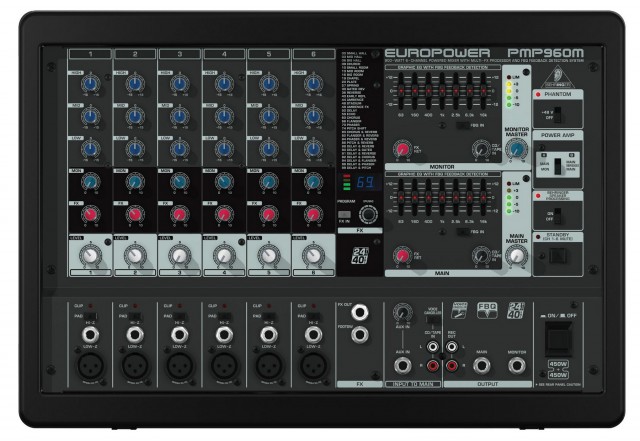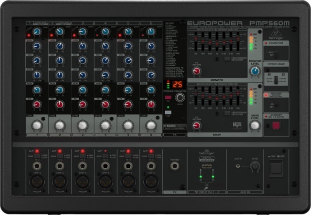 Активный 6-канальный пульт, 6 моновходов, 6 предусилителей, 24-битный процессор эффектов, FX канал, 2 х 7-полосных эквалайзера, мощность 2 х 450 Вт (мост 900 Вт), импеданс 4 - 8 Ом.