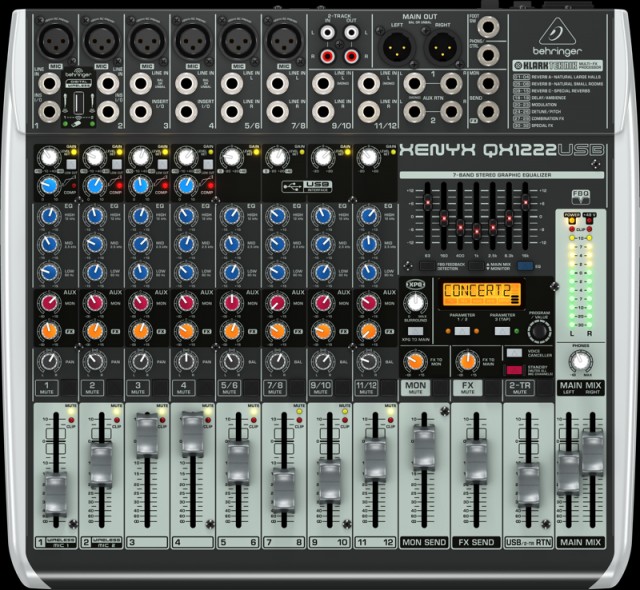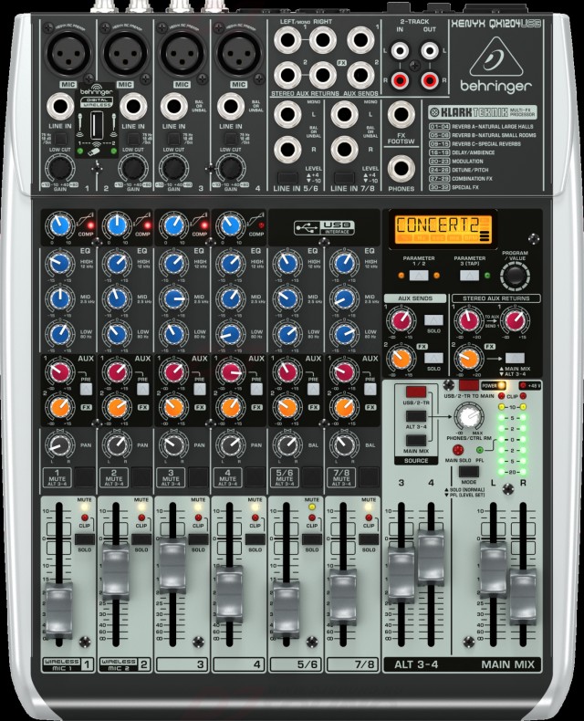 12-канальный микшерный пульт с USB-интерфейсом 16 бит/48 кГц, FX процессор, 4 моновхода с компрессорами, 4 стереовхода, 4 предусилителя, 3-х полосный эквалайзер, 1 FX-посыл, control room.