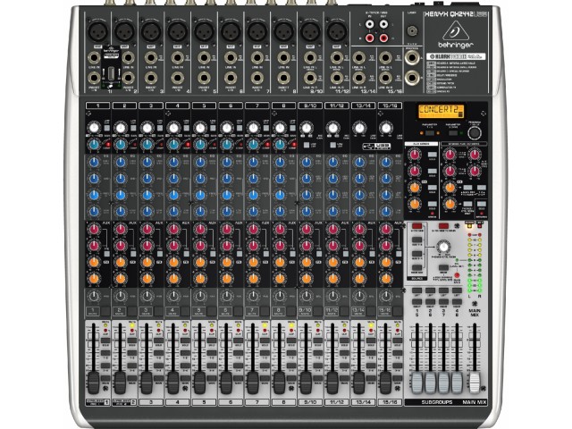 16-канальный микшерный пульт с USB-интерфейсом 16 бит/48 кГц, FX-процессор, 8 моновходов с компрессорами, 4 стереовхода, 10 предусилителей, 4-х полосный эквалайзер, 4 AUX шины, 4 подгруппы, 60-мм фейдеры.
