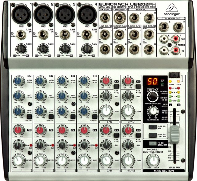 12-канальный пульт, 4 моновхода, НЧ-фильтр, 4 стереовхода, 4 предусилителя, 3-х полосный эквалайзер, 1 AUX шина, control room, питание +48 В, 60-мм фейдер.