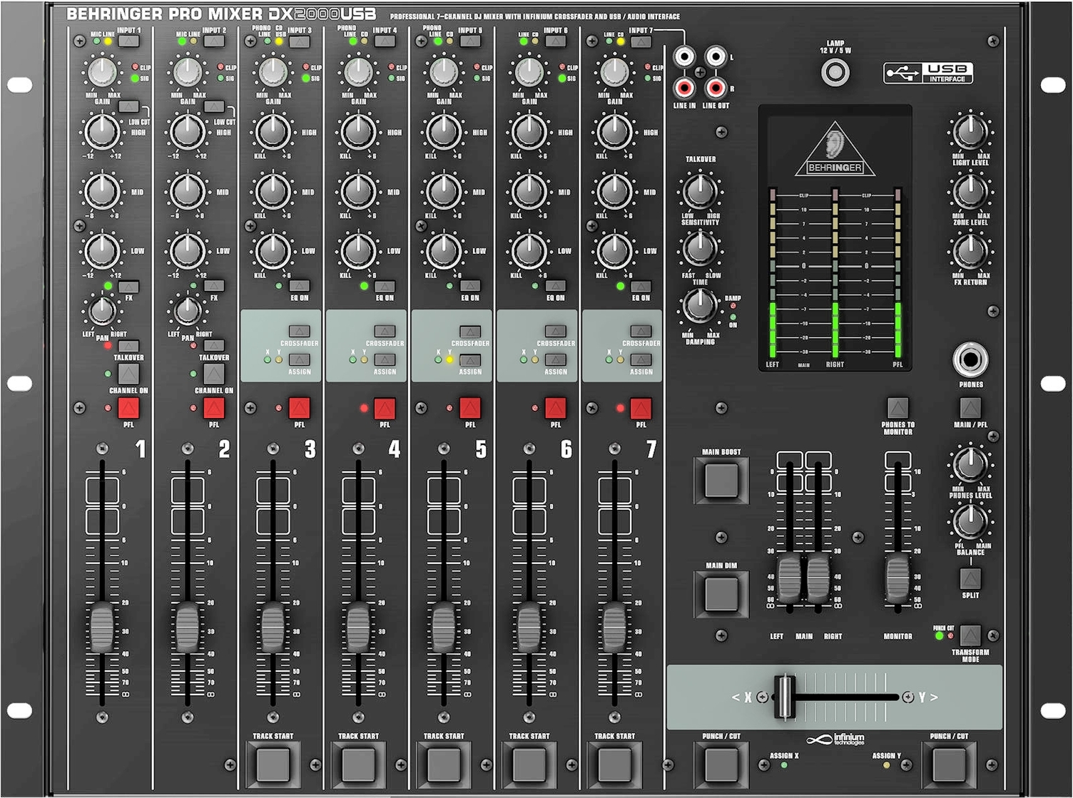 7 канальный 24-битный цифровой DJ-микшер с USB, 5 стереоканалов, 2 микрофонных канала, 3-полосный эквалайзер, кроссфейдер VCA с оптическим датчиком, стереовыход Zone, регулируемый выход на сабвуфер