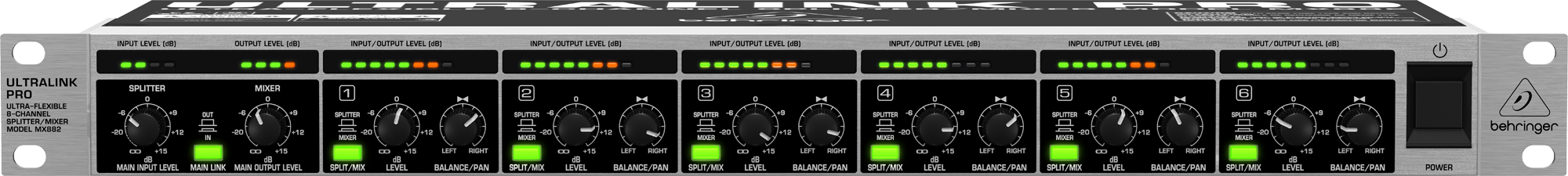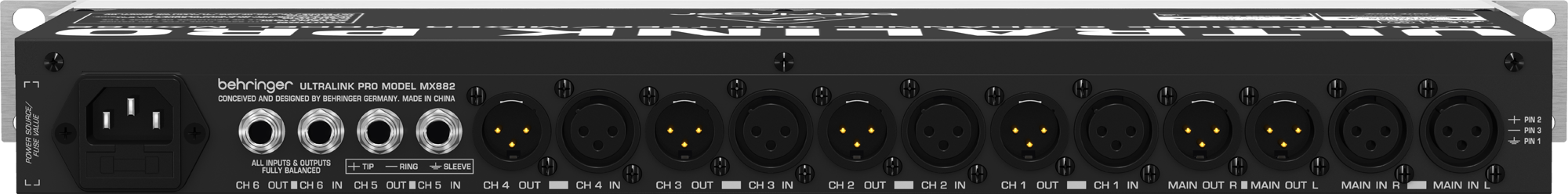 Behringer MX882 - универсальный 8-канальный маршрутизатор сигнала для микширования эффектов, мониторных усилительных систем, живого звука, театров, конференц-залов, отелей, церквей и пр. Каждый канал может работать как секция микшера или сплиттера Устройство может быть использовано как линейный микшер (8 входов/ 2 выхода), линейный сплиттер (2 входа/ 8 выходов), линейный усилитель/ DI-box (6 входов/ 6 выходов) или как преобразователь уровней сигнала (-10 dBV / +4 dBu).