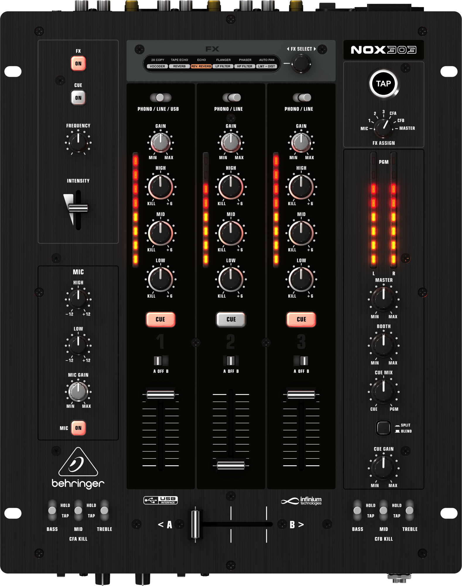 Behringer NOX 303 – это великолепное решение, как для начинающих, так и для давно практикующих ди-джеев, ценящих в своем оборудовании простоту и отзывчивость. Нехитрый дизайн лицевой панели данного устройства скрывает в себе интуитивно понятный интерфейс, позволяющий в считанные секунды произвести необходимые манипуляции с информацией поступающих со звуковых каналов, а красочные световые индикаторы наглядно отобразят текущий уровень сигналов.