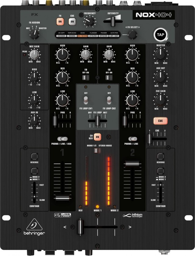 Behringer NOX 404 – 2-х канальный микшер обладает исключительными особенностями такими, как переключаемый FX LOOP и регулируемые кривые фейдера для каждого канала. Устройство снабжено микрофонными, линейным и USB-входами, поэтому вы можете принести весь ваш «арсенал» на выступление. Стерео AUX IN секция, дополненная регулятором уровня. Балансный XLR выходы и процессор эффектов в микшере делают его идеальным для ди-джеев.