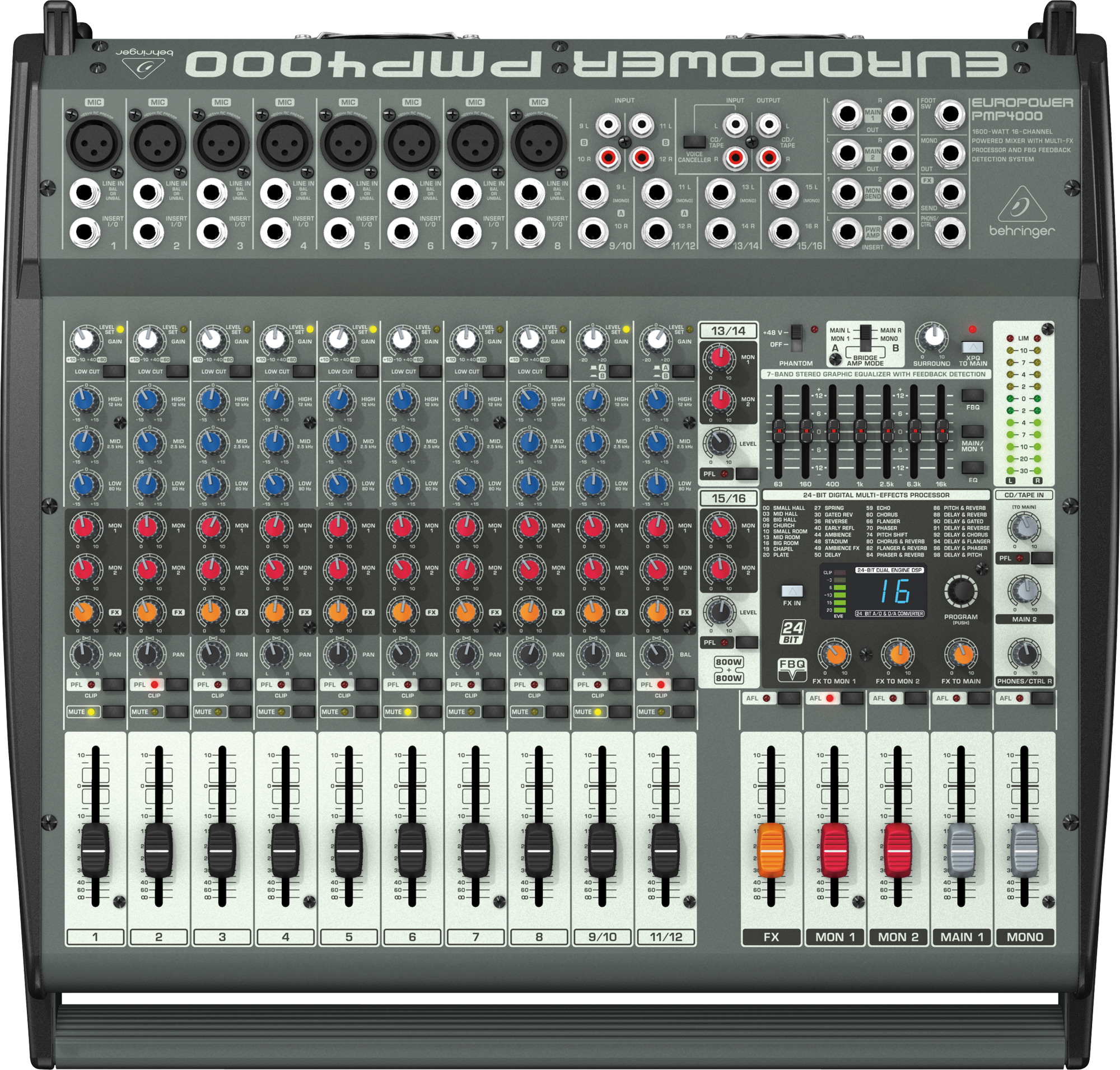 В основу микшера с усилителем Behringer PMP 4000 легла технология усилителей нового поколения, обеспечивающая более высокую производительность и кристально чистый звук при меньших размерах и весе. Эта модель мощностью 1600 Вт предлагает два 24-битных стереофонических процессора эффектов, "невидимые" микрофонные предусилители IMP, Voice Canceller и много других полезных функций.