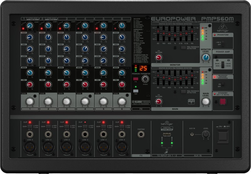 PMP560M имеет ряд функций, позволяющих создавать полностью завершенные миксы без подключения дополнительных устройств. Прежде всего к ним относится эффект-процессор KLARK TEKNIK. 25 поддерживаемых им пресетов включают в себя реверберацию, флэнжер, дэлей и им подобные часто используемые аранжировщиками эффекты. Два семиполосных эквалайзера – для main и monitor выходов, каждый со своим регулятором FX return и шкалой интенсивности – помогают завершить обработку частотной коррекцией.