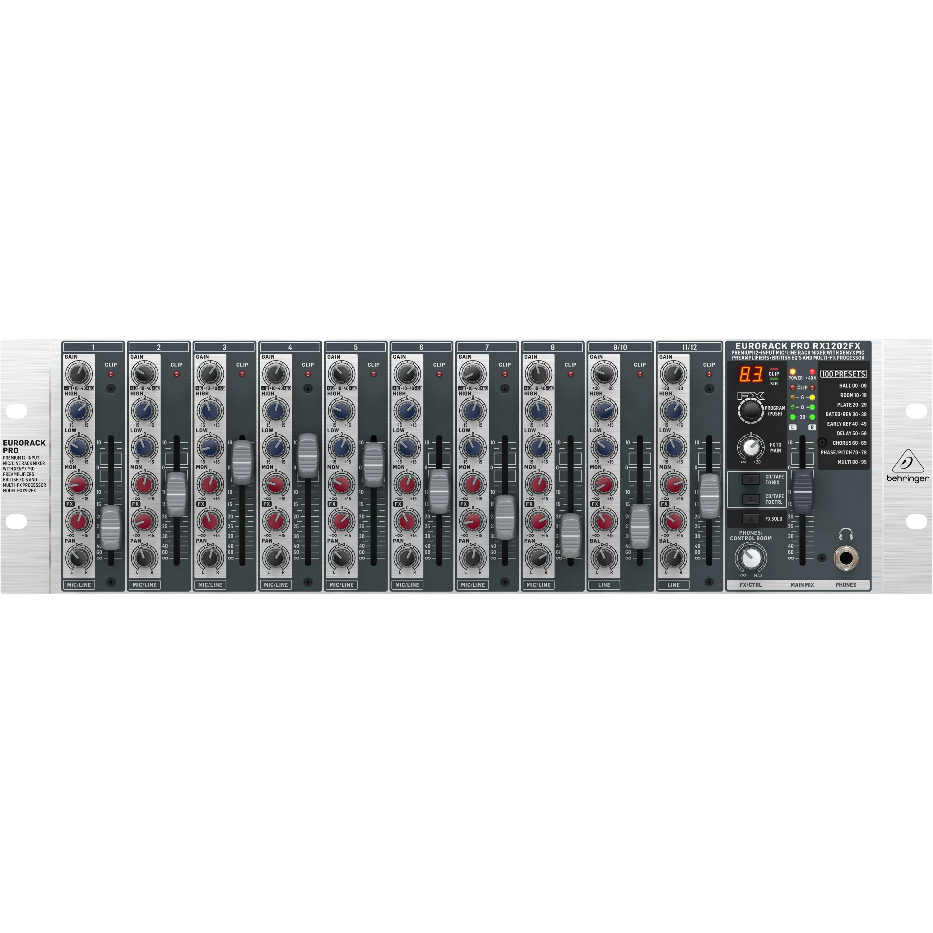 Behringer RX1202FX - cверхмалошумящий микшерный пульт с 12 входами, 2 шинами, высококачественными микрофонными предусилителями IMP и 24-битным мультиэффект-процессором. Этот универсальный рэковый микшер может быть использован как субмикшер для клавишных инструментов или ударных, для многоканального мониторинга, или как линейный микшер в стационарных аудио-/видеоинсталляциях.