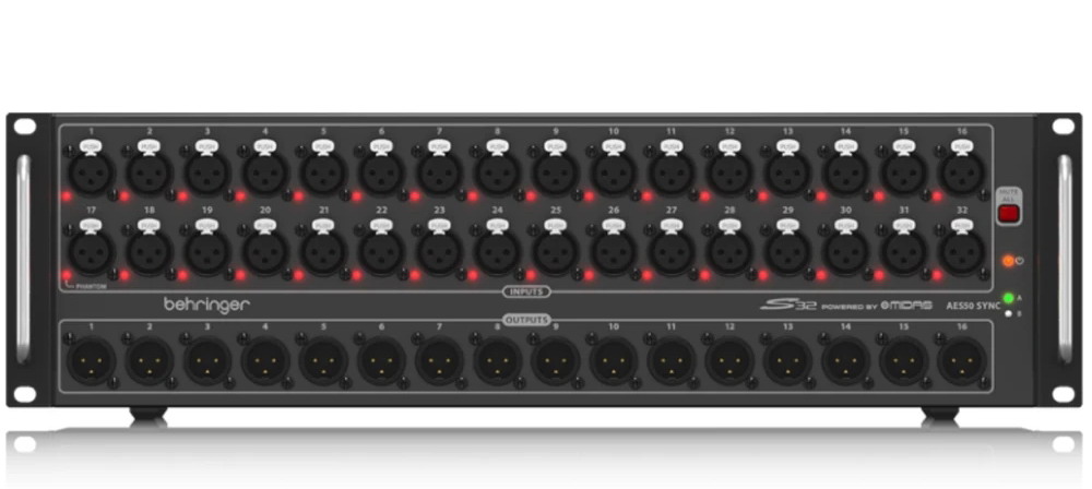 Behringer S32 – стейджбокс c 32 предусилителями Midas и 16 выходами. Новинка может использоваться как мультикор с любым аналоговым микшером или в связке с цифровой консолью X32 и системой персонального мониторинга.