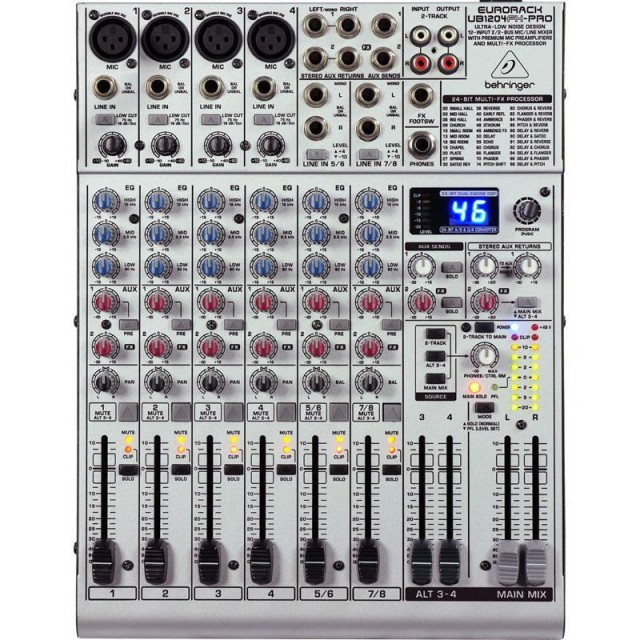 BEHRINGER Eurorack UB1204FX-PRO - сверхмалошумящий микшерный пульт с 12 входами, 2/2 шинами и высококачественными микрофонными предусилителями IMP и 24-битным процессором эффектов. Компактные размеры этого пульта ни как не сочетаются с тем объемом функцией и возможностей, которые он предлагает: 8 симметричных линейных входов с широким динамическим диапазоном, 4 микрофонных предусилителя IMP (Invisible Mic Preamp), 2 посыла AUX в каждом канале(1 префейдерный для мониторинга и 1 постфейдерный посыл, направляющий сигнал на внешние устройства).