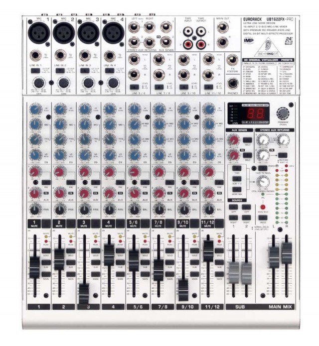 BEHRINGER UB1622FX-PRO – малошумящий 16-канальный микшерный пульт. Этот пульт, при своих весьма и весьма компактных размерах, а также небольшом весе, отличается выдающимися аудиокачествами и огромным разнообразием возможных функций. BEHRINGER UB1622FX-PRO оборудован микрофонным предусилителем High-End IMP (Invisible Mic Preamp) высочайшего качества с симметричными линейными входами, опциональным фантомным питанием, и имеет возможность подключения к внешним процессорам эффектов. Благодаря своим широчайшим и тщательно продуманным возможностям маршрутизации, пульт UB1622FX-PRO может с успехом применяться как в студии, так и на сцене.