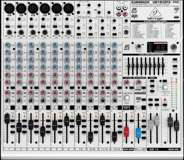 BEHRINGER UB1832FX-PRO – сверхмалошумящий микшерный пульт с 14 входами, 3/2 шинами, высококачественными микрофонными предусилителями IMP и 24-битным эффект-процессором. Если Вы ищете эффективный компактный микшер с впечатляющим эффектом объёмного стереозвучания 3D XPQ и 9-полосным графическим стереоэквалайзером, то UB1832FX-PRO – это Ваш пульт.