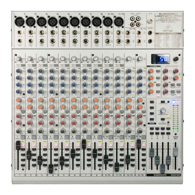 BEHRINGER UB2442FX-PRO – это универсальное и практичное решение в вопросах профессионального микширования звука для студий или концертов. Несмотря на свои компактные размеры, устройство удивительным образом сочетает в себе высокую потенциальную мощность, а так же продвинутый функционал и инструментарий, позволяющие пользователю воплотить в жизнь все свои творческие задумки. Сверхмалошумящий микшерный пульт с 16 входами, 4/4 шинами, высококачественными микрофонными предусилителями IMP и 24-битным эффект-процессором.
