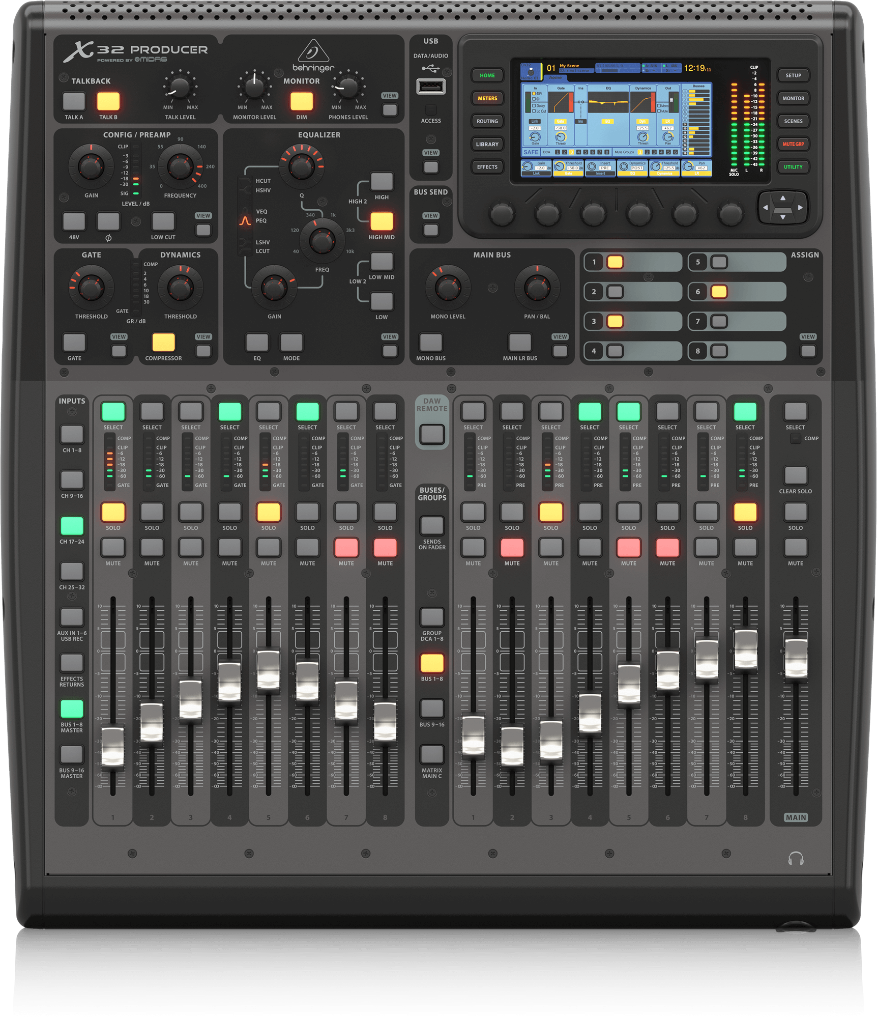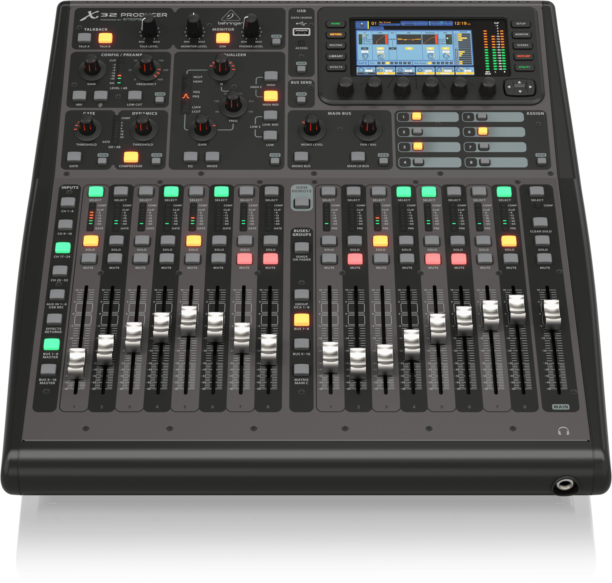 Благодаря своему легендарному встроенному микс-движку X32, X32 PRODUCER может быть вашим первоклассным студийным записывающим интерфейсом сегодня, управлять сложной театральной постановкой завтра или надежно располагаться в вашей боковой стойке, пока вы микшируете выступление вашей группы в клубе с вашего iPad. Революция сама по себе, невероятный X32 PRODUCER сочетает в себе лучшие аналоговые входы/выходы и мощное цифровое подключение с обширной обработкой для 40 каналов, 25 шин и до 152 источников сигнала.
