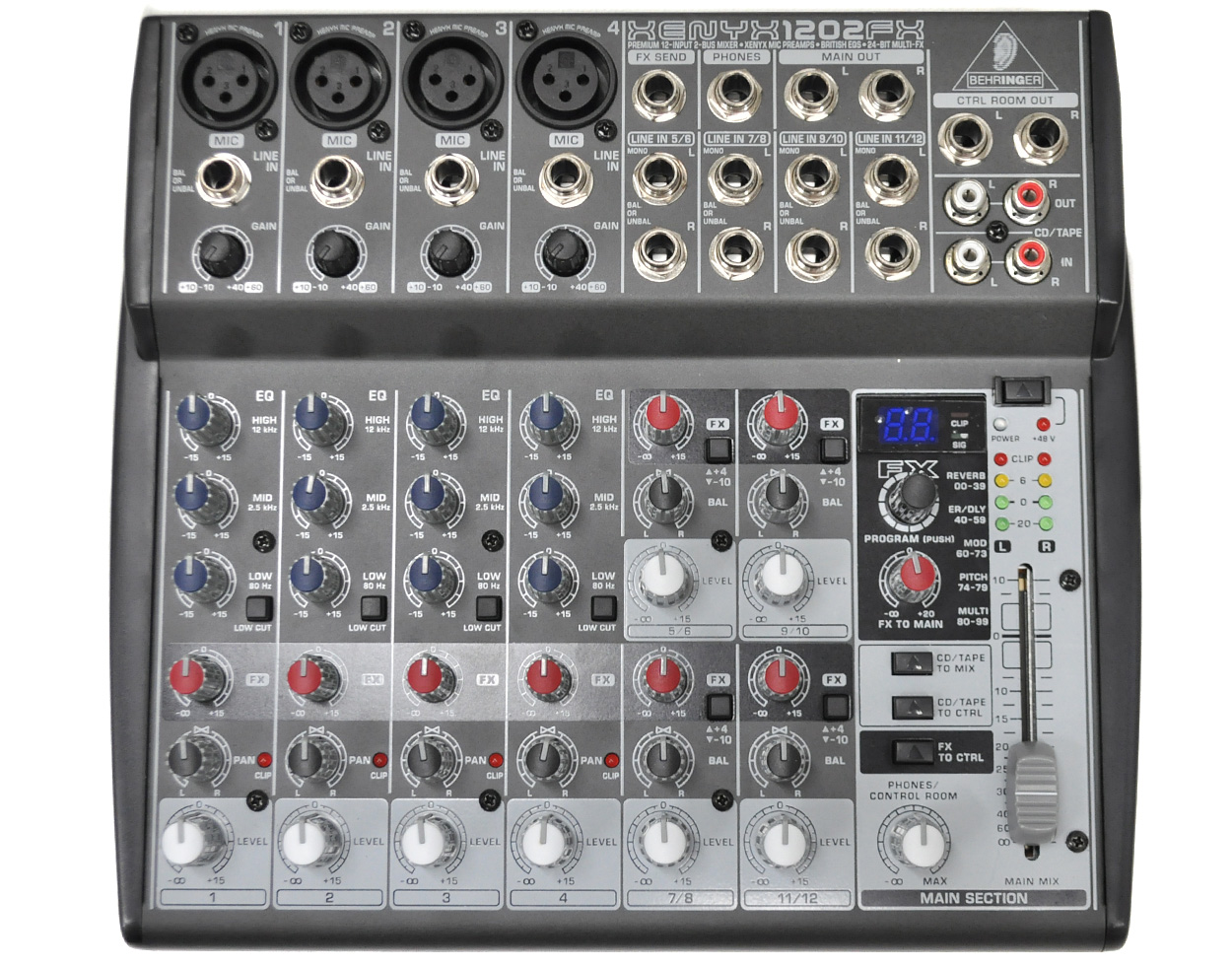 Behringer XENYX 1202FX - компактный малошумящий микшерный пульт премиум-классас 24-битным стереофоническим эффект-процессором. Оснащен 4 моновходами, 4 стереовходами, 1 шиной Aux и регулятор посыла FX Send в каждом канале. Также предусмотрены назначаемые входы CD/tape для гибкой маршрутизации.