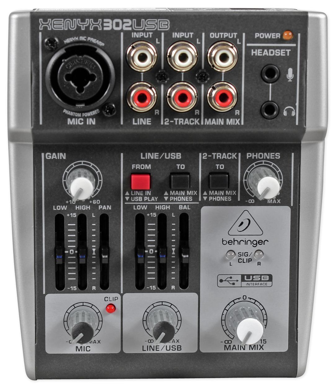Behringer XENYX 302USB - 5-входовый микшерный пульт премиум-класса с USB-аудиоинтерфейсом, высококачественным микрофонным входом, линейным стереовходом, стереовходом для подключения аудиовоспроизводящих устройств, британскими 2-полосными канальными эквалайзерами, выходом Main Mix, выходом для наушников и питанием от шины USB или внешнего адаптера сетевого питания.