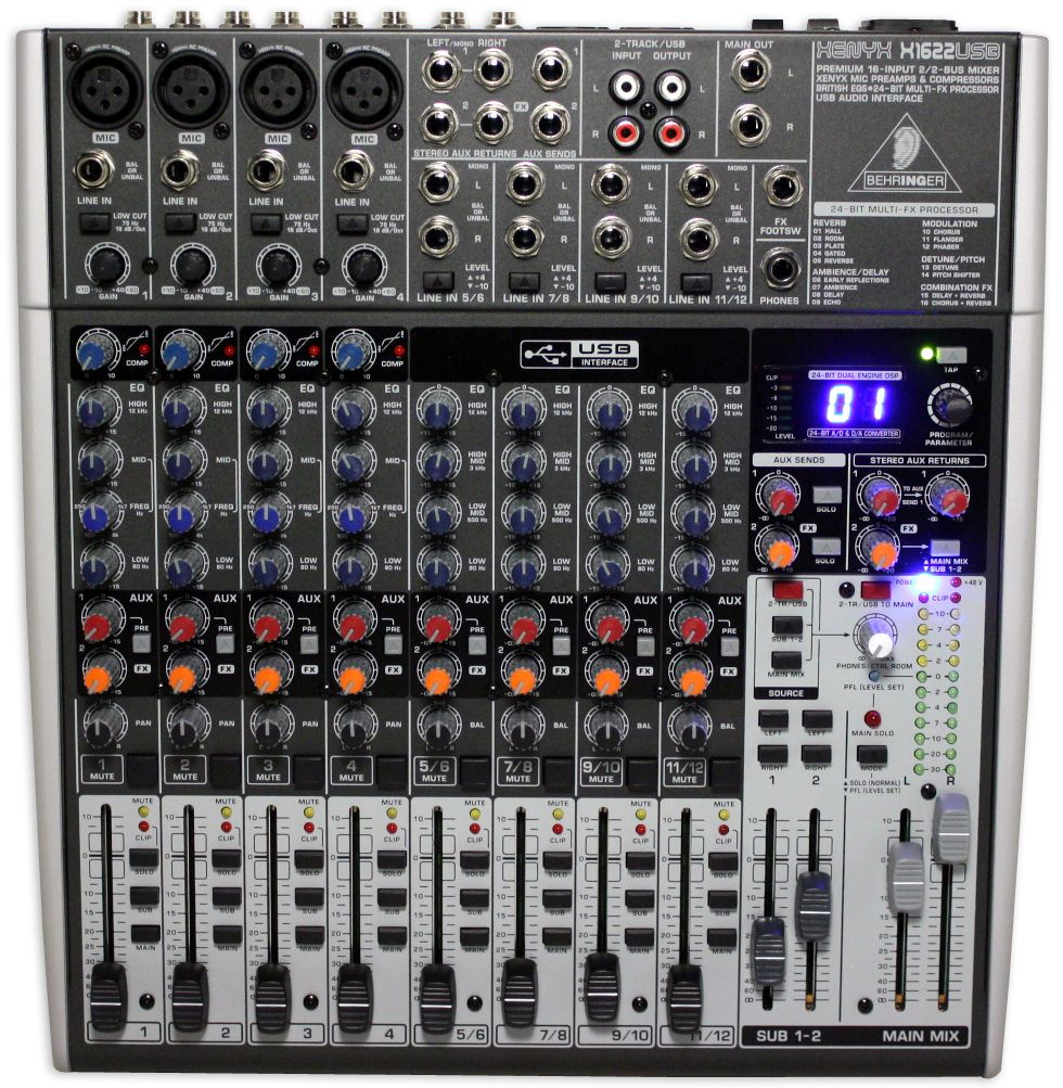 Behringer XENYX X 1622USB - малошумящий 16-канальный аналоговый микшерный пульт премиум-класса с 2 выходными подгруппами, высококачественными микрофонными предусилителями Xenyx, "британскими" эквалайзерами, 24-битным мультиэффектпроцессором, канальными инсертами, 2 AUX-посылами на каждом канале, интегрированным интерфейсом USB/Audio, и набором профессиональных программ для записи и редактирования музыки.