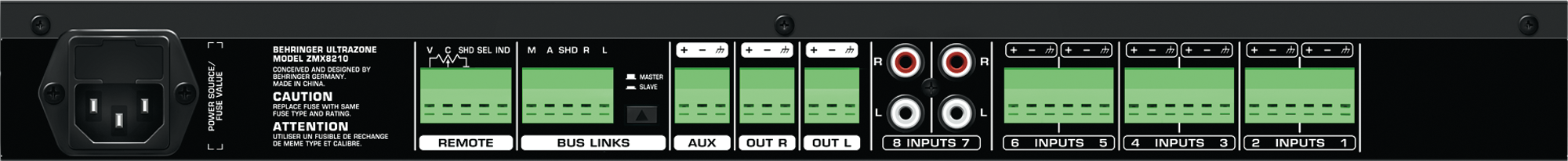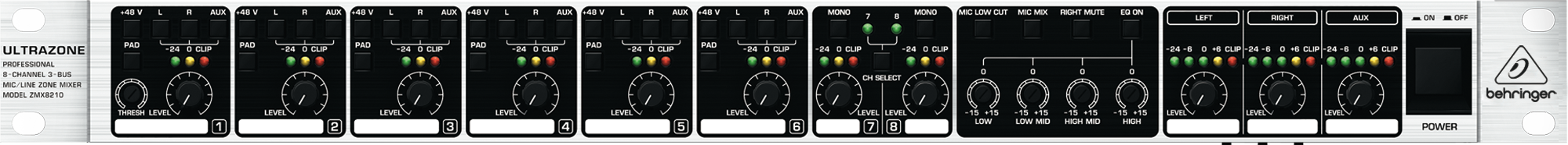 Behringer ZMX8210 представляет собой стационарный зонный микшер с восемью входами, первые шесть из которых - микрофонно-линейные, балансные, реализованные на инсталляционных разъемах евроблок, а два последних - стереофонические линейные небалансные на разъемах RCA (активен может быть только один из стереоканалов, по выбору). Каждый монофонический вход имеет регулировку чувствительности, аттенюатор (-20 дБ), кнопку включения фантомного питания и индикатор уровня. Уменьшить нежелательные шумы можно с помощью отключаемого обрезного фильтра низких частот. Предусмотрен приоритетный режим первого входа с функцией регулировки ослабления остальных сигналов в момент важных сообщений ("ducking"). Тремя кнопками в каждом монофоническом канале осуществляется маршрутизация сигнала на три независимые выходные шины (L, R, Aux), причем каждая из этих шин имеет персональный регулятор усиления. Со стереовходов левый и правый сигналы всегда подаются на соответствующие L/R шины выходов (также предусмотрено преобразование в моно), а на выход Aux приходит их сумма.