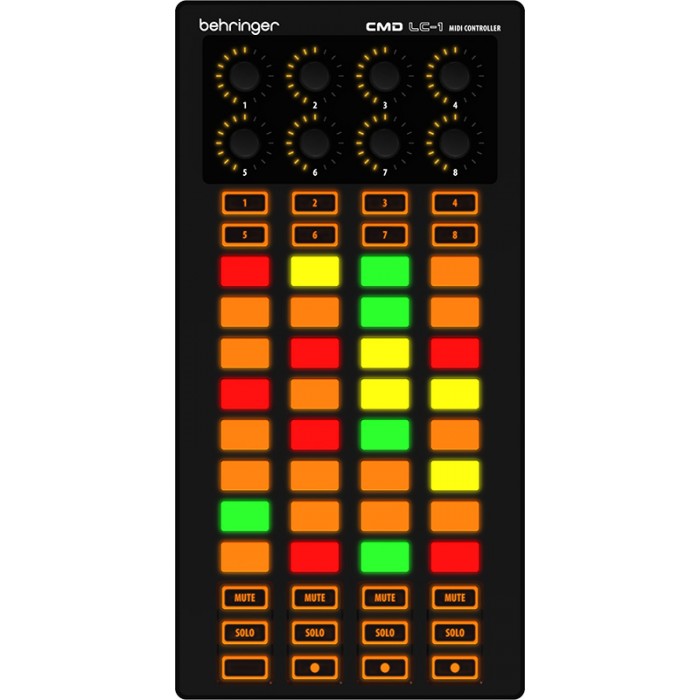 Behringer CMD DV-1 - представляет собой мощный триггерный USB-MIDI модуль для работы с программным обеспечением Ableton Live и другими программами. Клип-секция имеет 4х8 кнопок с 4-цветной индикаторной подсветкой – обратная связь по MIDI. Секция контроля эффектов с 8 поворотными регуляторами и 8 кнопками располагается над клип-секцией. Ниже клип-секции - канальные кнопки Mute, Solo и кнопки включения записи.