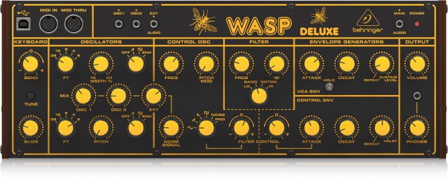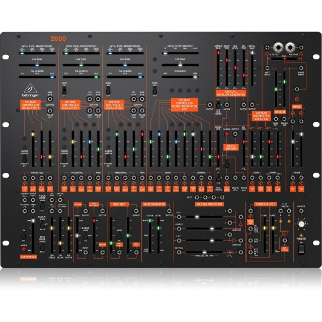 Монофонический синтезатор, 3 VCO с регулируемой шириной импульса, генератор шума, кольцевой модулятор, предусилитель и повторитель огибающей, стерео VCA, OSC1: пилообразный и импульсный сигнал, OSC2-3: с переключаемой си...