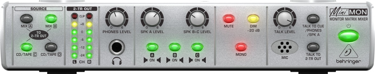 Компактный матричный микшер для студийного мониторинга, селектор на 4 источника, переключатель для 3-х мониторов, регуляторы уровня, блок служебной связи.