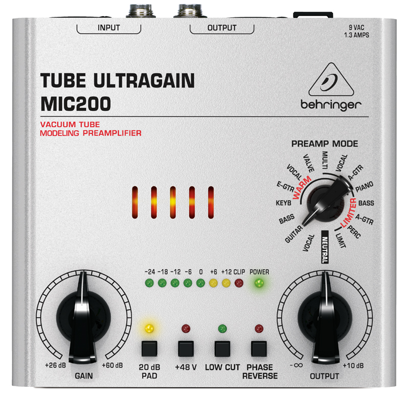 Компактный микрофонно-линейный предусилитель с функцией моделирования 16 алгоритмов предусилителей, 8-сегментный светодиодный индикатор, стрелочный VU-индикатор.