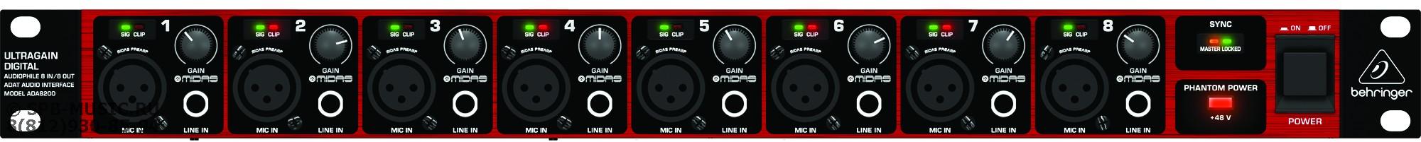 8-канальный конвертер с микрофонными предусилителями MIDAS, 44.1/48 кГц, 24 бита, синхронизация Word Clock или ADAT, 8 микрофонных входов с фантомным питанием, 8 линейных входов TRS, ADAT вход.
