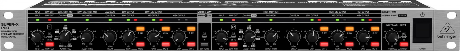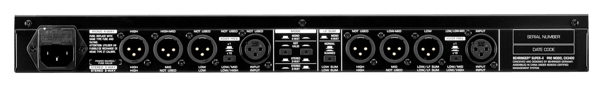 Behringer SUPER-X PRO CX3400 - это активный кроссовер, разделяющий сигналы в стереорежиме на 2 или 3 частотные полосы, а в монорежиме - на 4 полосы. Каждая полоса наделена фильтром Линквица-Райли 4-го порядка (24 дБ/октава) и индивидуальным лимитером. Дополнительная функция задержки сигнала до 2 мс обеспечивает выравнивание фазы между динамиками громкоговорителей. На каждом выходе предусмотрен переключатель полярности, позволяющий быстро инвертировать фазы динамиков и рупоров системы.