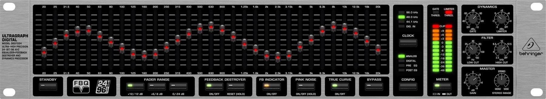 Цифровой многофункциональный стереофонический 31-полосный эквалайзер, 24/48-битный DSP, АЦ и ЦА преобразователи 24-бит/96 кГц, входы: аналоговые, AES/EBU и S/PDIF, система обнаружения обратной связи FBQ.