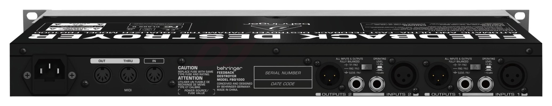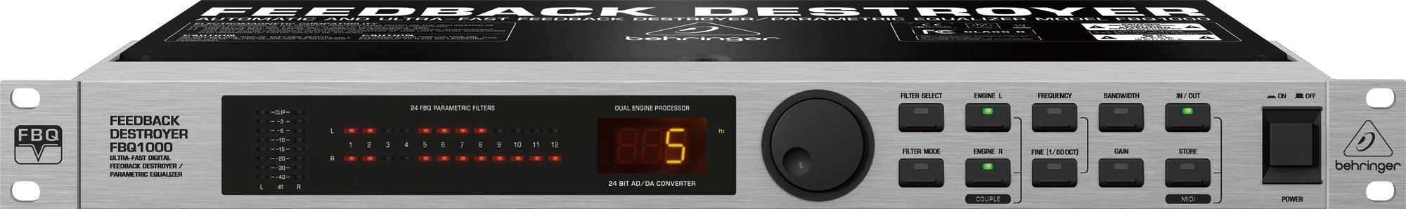 Behringer FBQ1000 - автоматический ультрабыстрый 2-канальный подавитель обратной связи и параметрический эквалайзер с 24 FBQ-фильтрами, операционными режимами Auto, Single-Shot и Manual, балансными входами и выходами с разъемами XLR и 1/4 TRS, MIDI-портом, светодиодным 3-знаковым системным дисплеем и светодиодными индикаторами активности каждого из 24 фильтров.