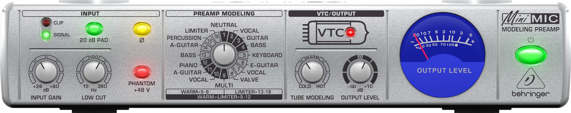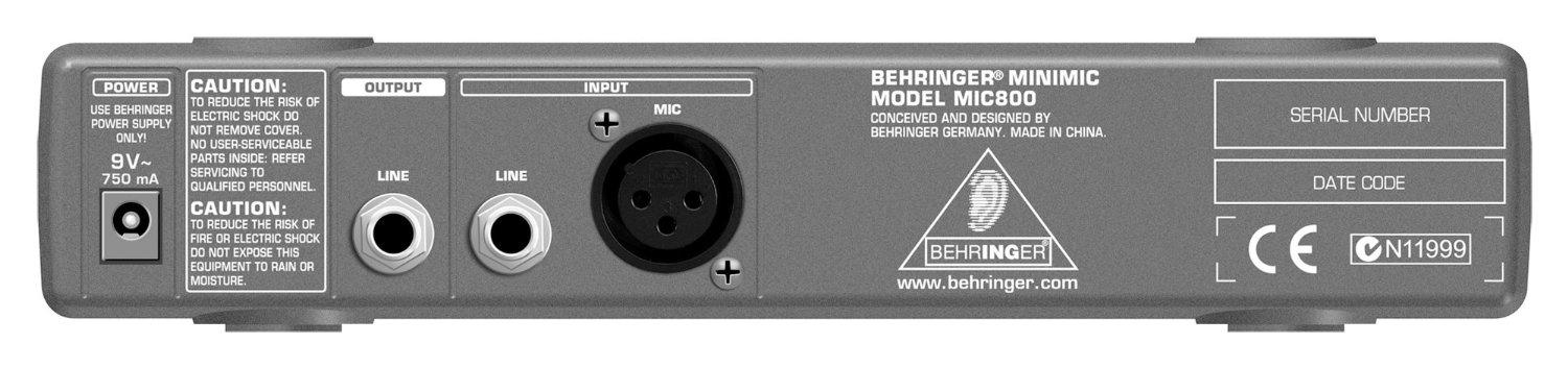 Behringer MINIMIC Mic 800 оснащен усовершенствованным выходным лимитером, предотвращающим искажение выходного сигнала. Отдельный обрезной низкочастотный фильтр удаляет из сигнала механические шумы, сценический гул и пр. Фантомное питание +48 В и аттенюатор 20 дБ обеспечивают дополнительную гибкость в работе, а стрелочный VU индикатор предлагает визуальный контроль уровня.