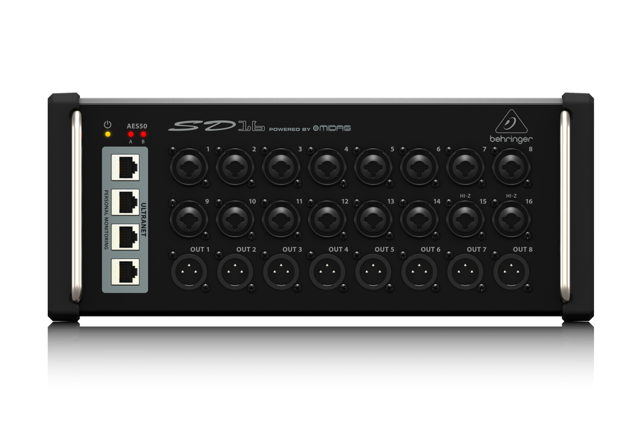 Behringer SD16 - SD16 - это идеальное решение для подключения на сцене оборудования с консолью Front of House (FOH). Стейдж бокс имеет 16 полностью программируемых микрофонных предусилителей MIDAS, 8 аналоговых сбалансированных XLR возвратов, а также встроенный распределительный порт ULTRANET для прямого подключения к системе персонального мониторинга P16-M – без какого-либо дополнительного оборудования. Кроме того, SD16 чрезвычайно компактен и оснащен прочными защитными бамперами. Дистанционное управление осуществляется через экранированный кабель CAT5e длиной до 100 метров. Когда SD16 используется как часть Х32 системы, три SD16 могут быть каскадированы через встроенный AES50 порт, обеспечивая до 48 двунаправленных входов и 24 сбалансированных XLR выходов. Встроенный распределительный порт ULTRANET обеспечивает питание и 16 аудио каналов к 4 BEHRINGER POWERPLAY P16-M через экранированный кабель CAT5e. 2 программируемых входа совместимы с источниками Hi-Z, для подключения клавишных, акустических, бас-гитар, и т.д., без необходимости использования DI бокса. SD16 также оснащен портом USB для быстрого и легкого обновления системы
