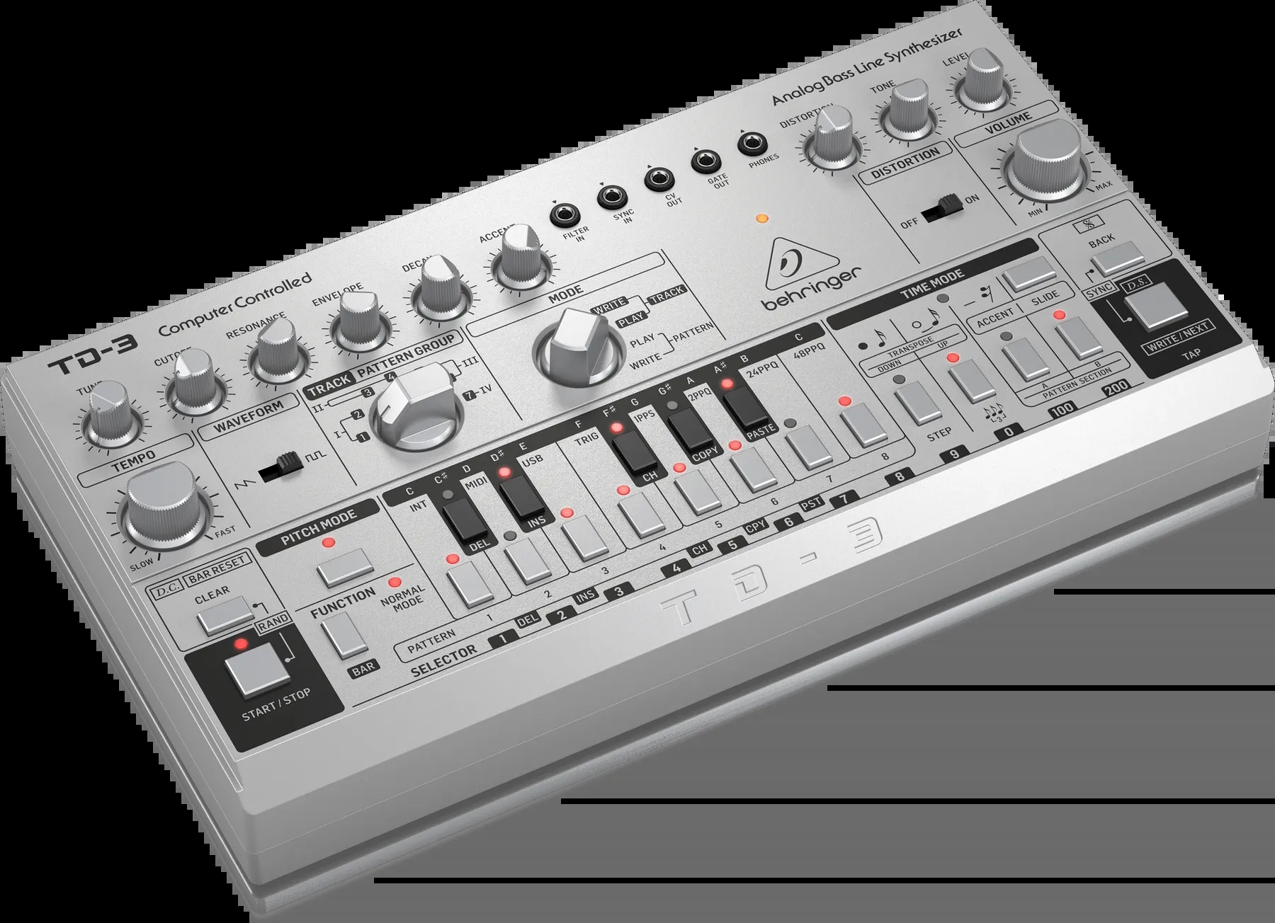 Behringer TD-3-SR - аналоговый басовый синтезатор и секвенсор, воспроизводящий пульсирующие ритмы и сильные басовые звуки, которые определяют электро-фанк, acid, техно и хаус в течение последних 30 с лишним лет.
